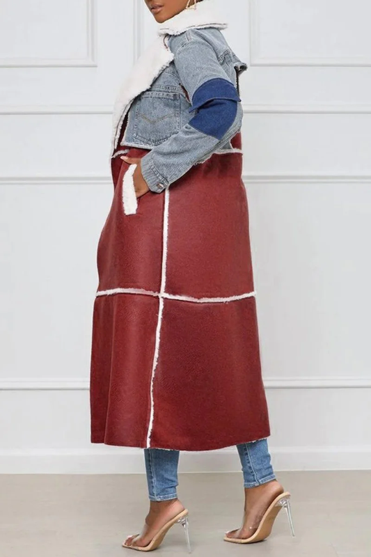 AS | Ležérní džínový kabát z jehněčí kůže s ohrnovacím límcem z umělé kožešiny a páskem