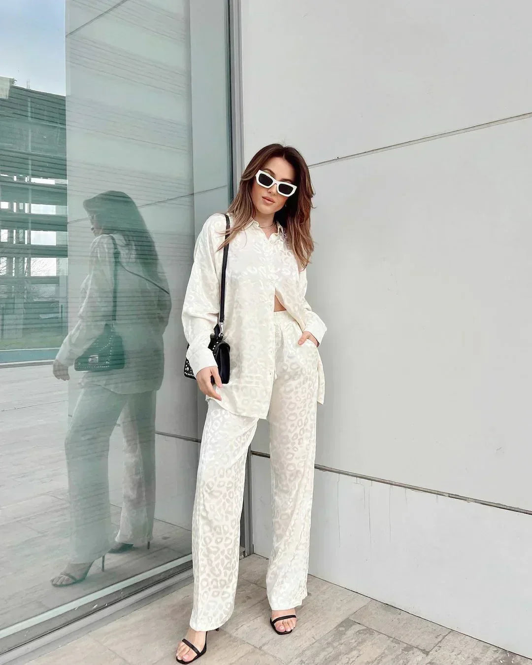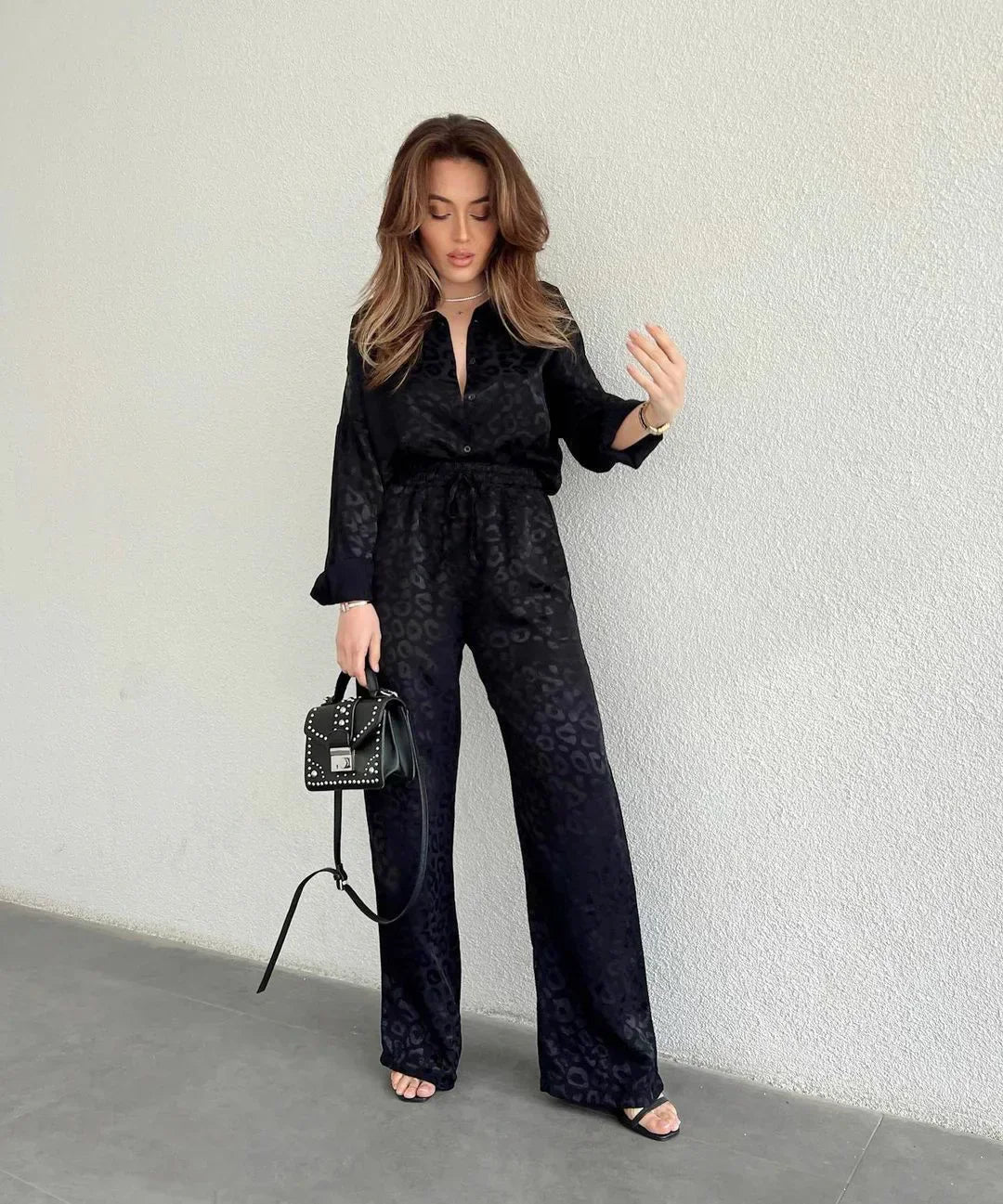AS | Elegantní halenka s jednořadovou knoflíkovou légou a široké kalhoty