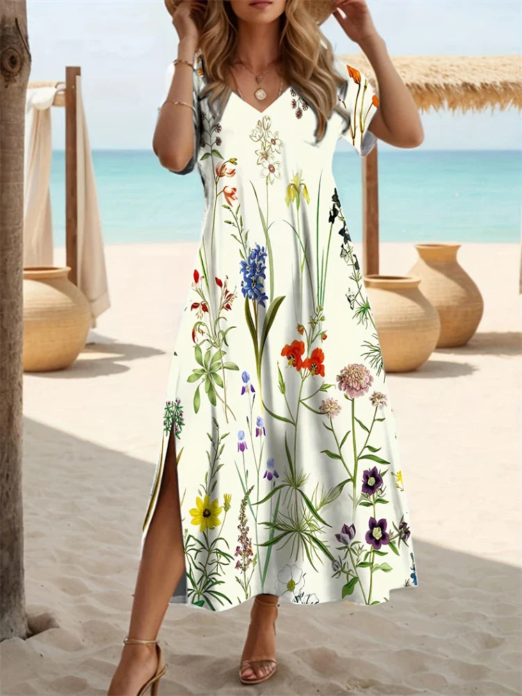 AS | Nové květinové šaty s potiskem Havajské dlouhé šaty Dámské šaty s krátkým rukávem Módní letní šaty s výstřihem V Designs Summer
